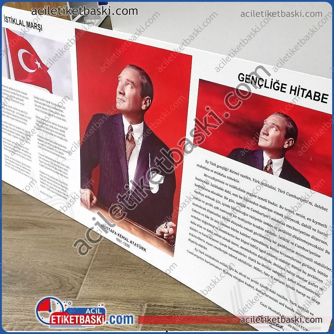 Okullar, kurumlar, resmi işletmeler ve eğitim alanları için özel olarak üretilen Atatürk Resmi – İstiklal Marşı – Gençliğe Hitabe üçlü pano seti, yüksek dayanıklılığa sahip 5mm sağlam taban malzemesi üzerine uygulanmıştır.
