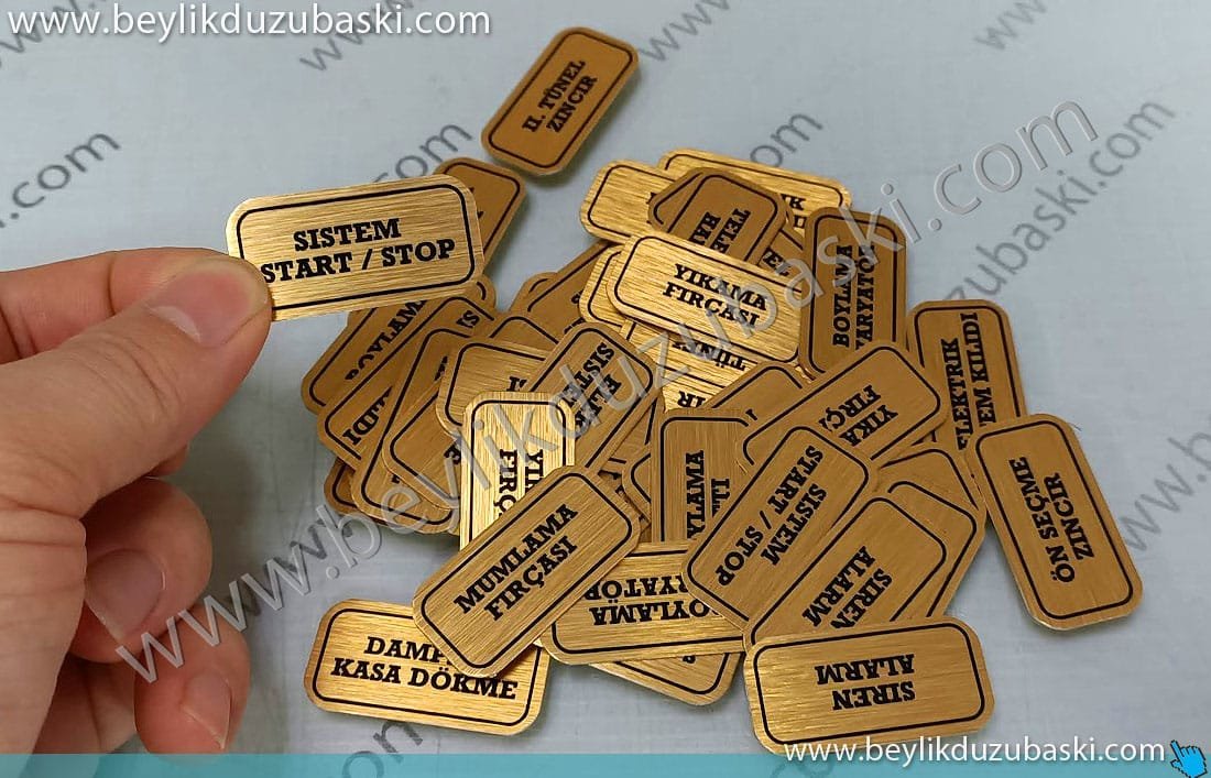 sarı metal, prinç plaka görünümlü, alüminyum etiket, 05 mm kalınlık alüminyum plaka, acil baskı, aynı gün kargo