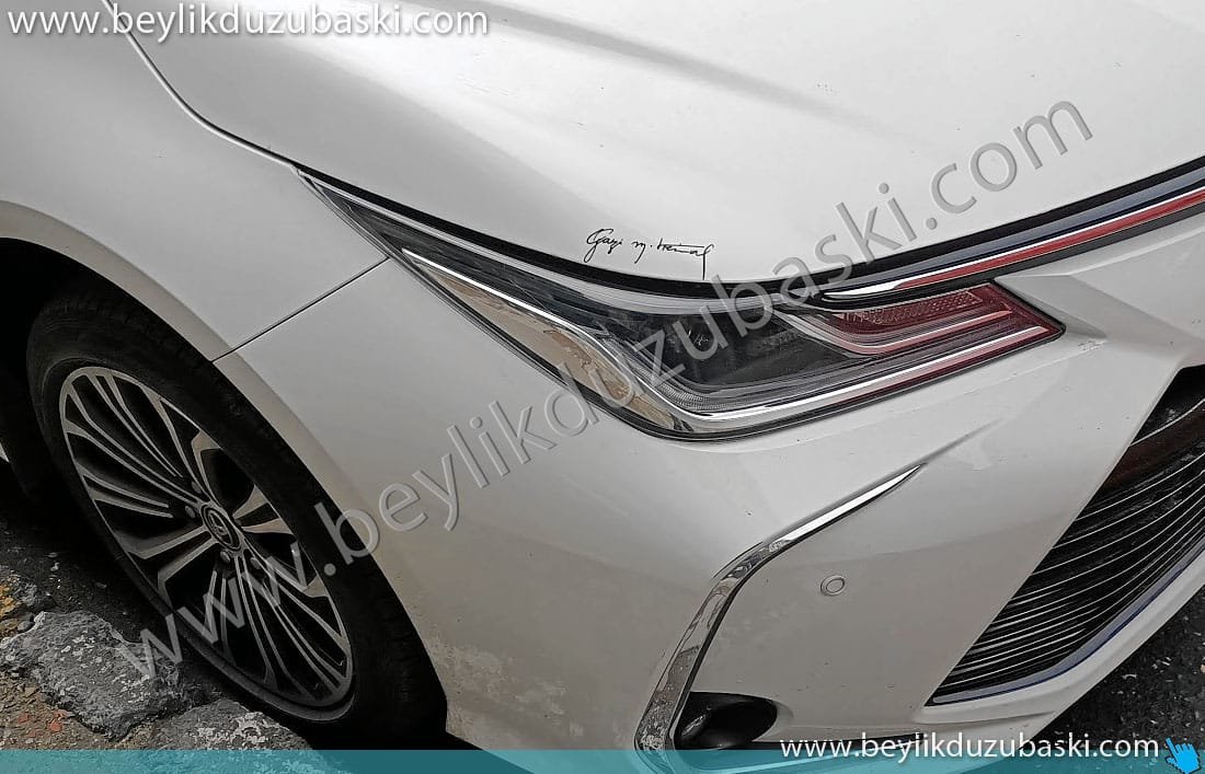 on vehicle headlight, gazi mustafa kemal, signed sticker printing, outdoor durable, vehicle sticker, on car hood, sticker, Atatürk signature sticker, outdoor durable, wash, water, sun-based, car sticker, small signature sticker, Ataturk signature small size, gazi mustafa kemal signature, car headlight, will not stand on the hood, will not deform, quality sticker, sticker