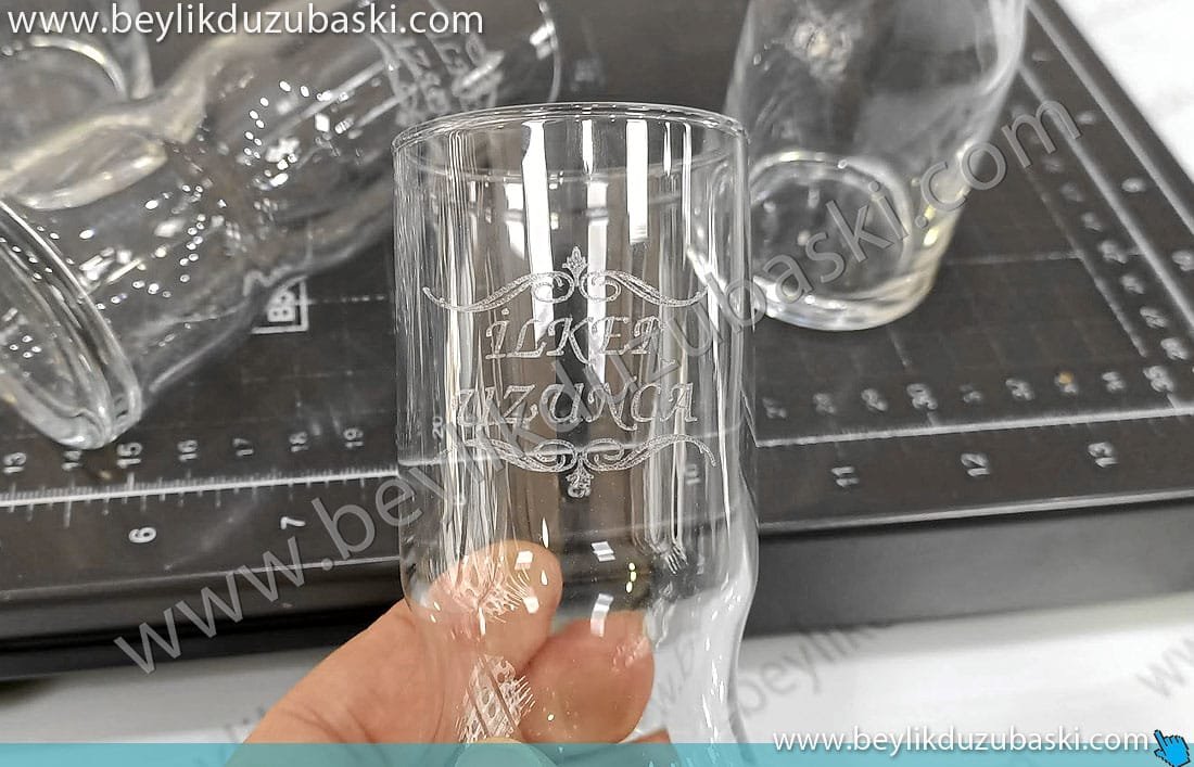 Rakı bardağına baskı, lazer ile rakı bardağı baskısı, bekle al, ürün sizden, baskı bizden, az adet bardak baskıları yapılır, su bardağı, rakı bardağı, acil bardak baskısı, cam baskı, cama baskı, kazıma lazer cam baskı