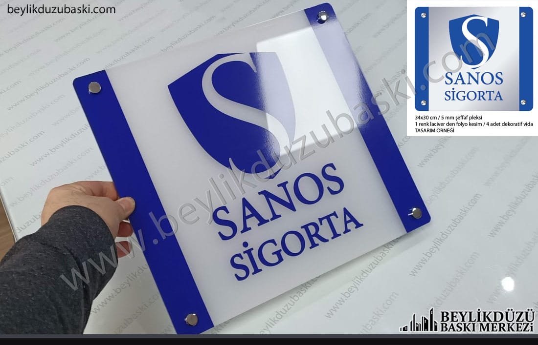 Pleksi Kapı isimliği, 34x30 cm ebadında, 5 mm rakı rengi pleksi, kaliteli kapı tabelası, sanos sigorta için, yapılan, kapı giriş tabelası