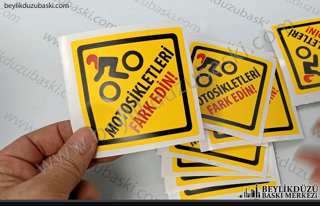 motosikletleri fark edin etiketi, dış mekan dayanıklı etiket, en az 5 adet gönderim yapılır, 5 adet için toplam fiyattır, adetli üretim için adede göre fiyat alınız, araç etiketi, uyarı etiketi