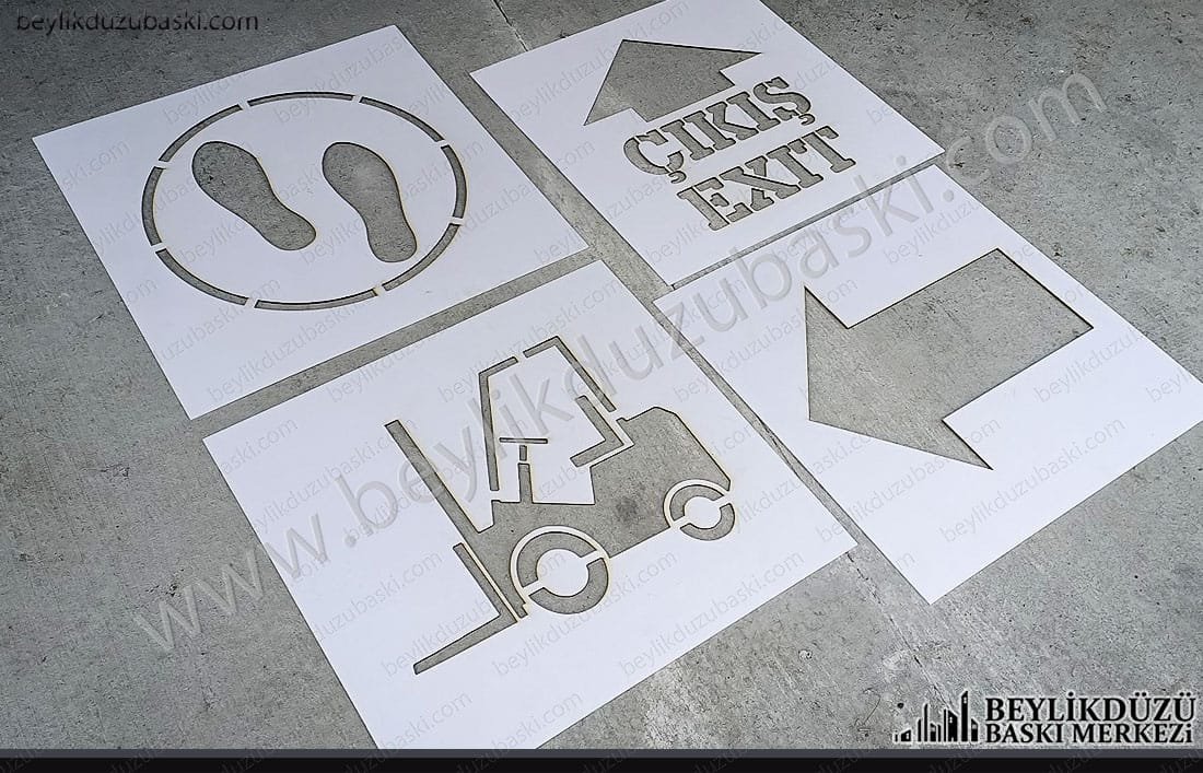 Fabrika içlerinde yönlendirme için, boyama şablon üretimi, forklift şablon, yaya yolu şablon, acil çıkış şablon, vinç şablon, yangın söndürme şablon, boyama şablon kesimi, plastik malzeme, aynı gün gönderim, tasarım desteği