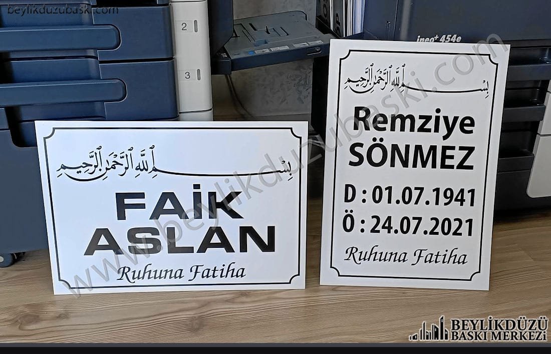 mezar başlığı, mezar taşı baskı, 5 mm plastik ürün üzerine baskı, vefat için tabela baskı, geçici kullanımlı ürün, aynı gün kargo, mezar taşı acil ürün