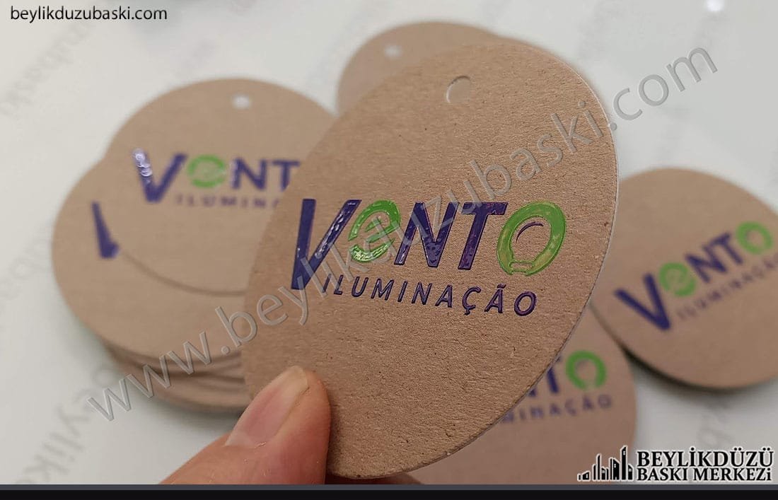yuvarlak karton etiket, kraft görünümlü, baskılar kabartma laklı, matbaa üretimi, üzeri delikli ürün, en az 1000 adet yapılır, kaliteli ürün, delikli ürün etiketi