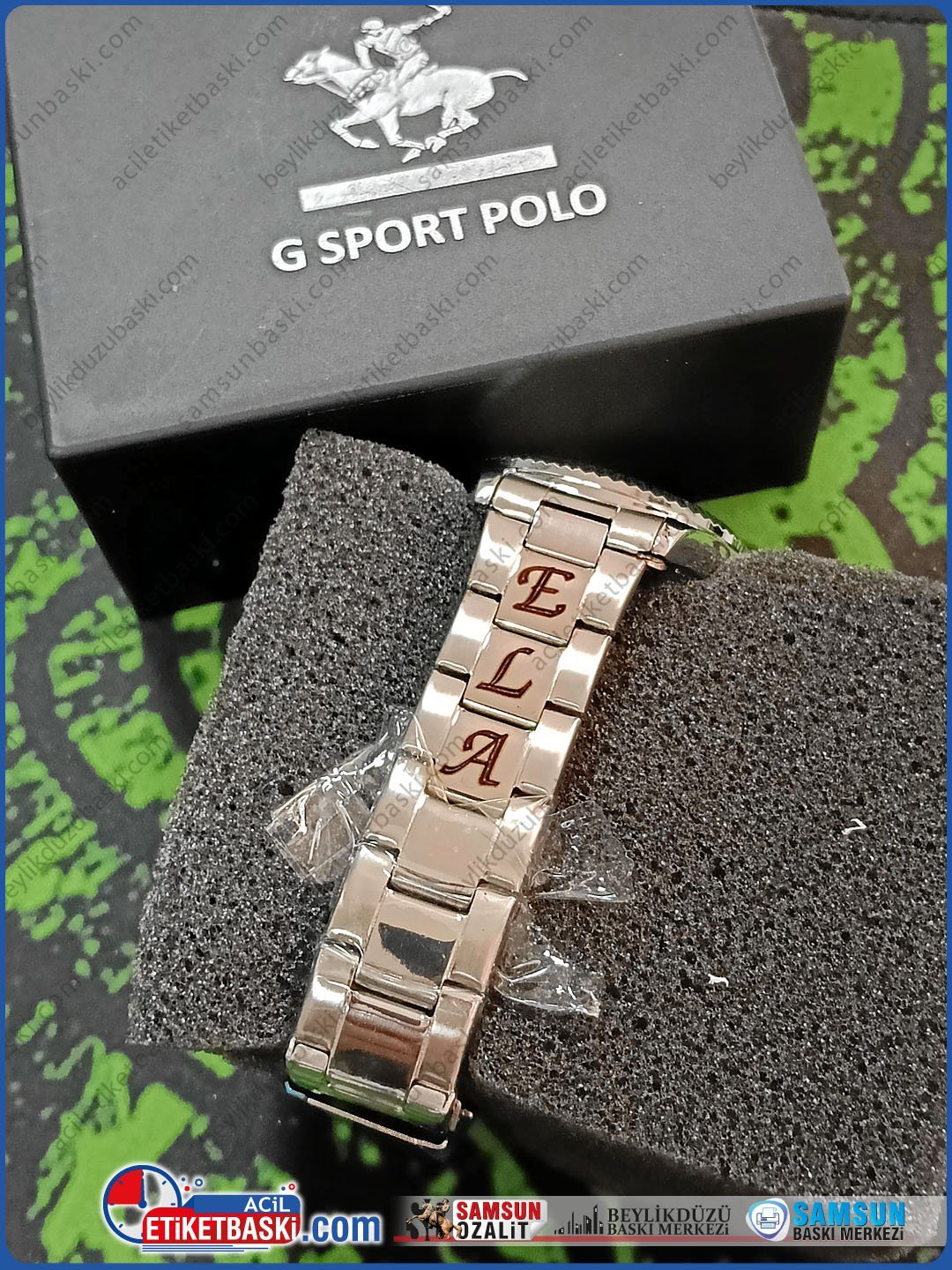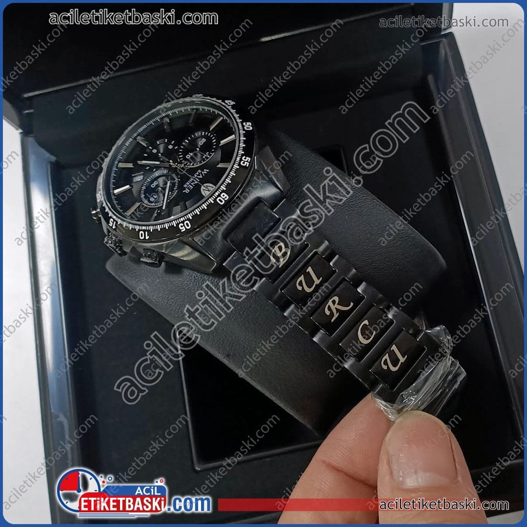 saat kordonuna baskı, metal lazer kazıma, isme özel saat kordonu, kalıcı lazer markalama, hediyelik eşya baskı, çelik kordon isim yazma, numune lazer baskı, kişiye özel metal baskı