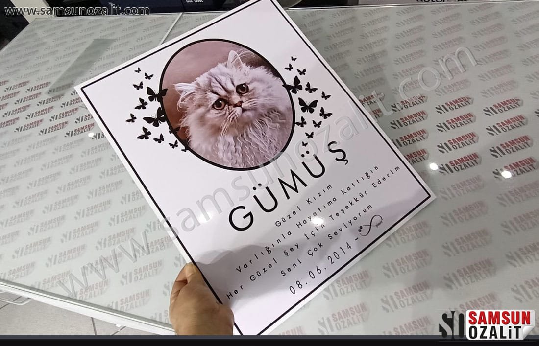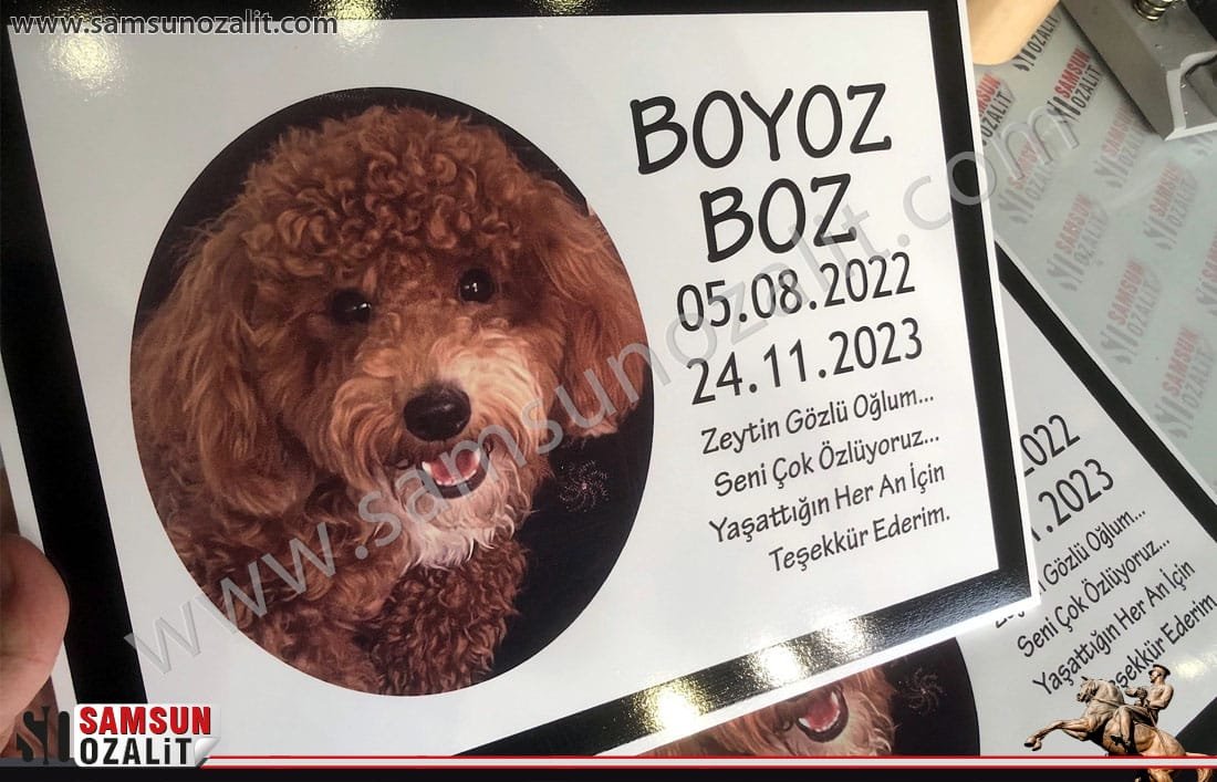 Samsun Baskı merkezi, evcil hayvan mezar taşı, evcil kedi ölümü için hazırlanmış mezar yazısı, kedi köpek için mezar başlığı, mezar taşı baskısı, özel tasarımlarınız yapılır, dış mekan dayanıklı plastik ürün, suya dayanıklı ürün, 5mm plastik