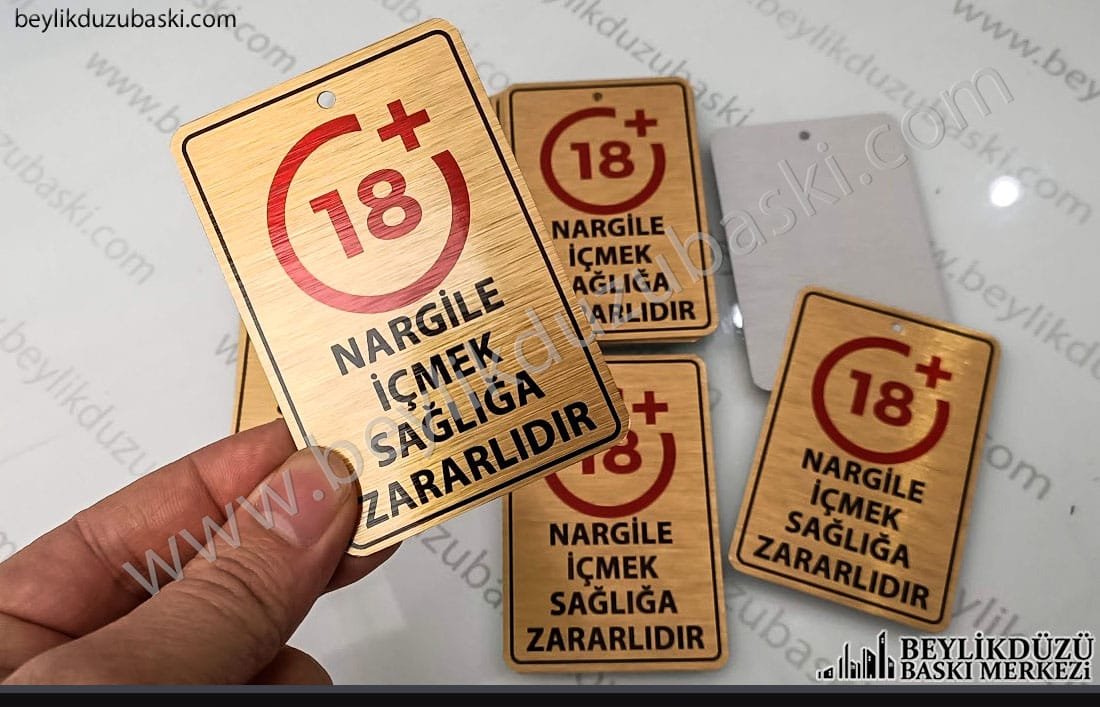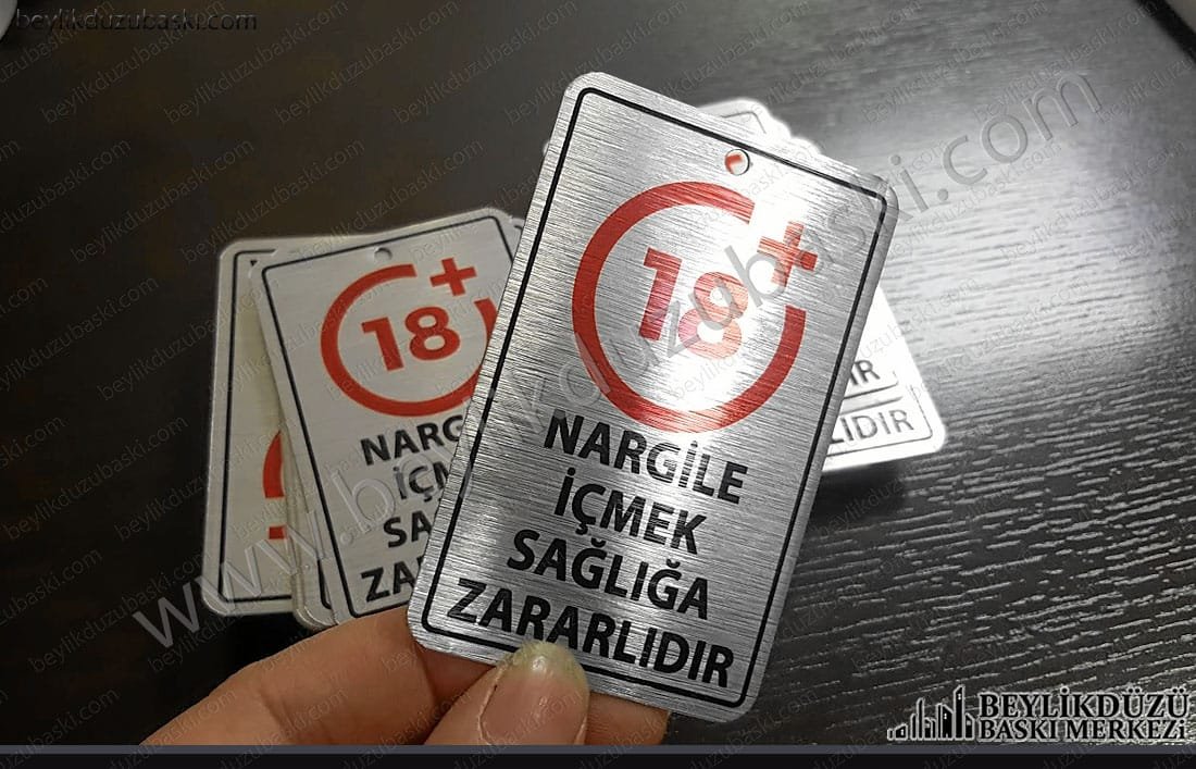 tütün ürünleri için uyarı tabelası, nargile üzerine takılan uyarı tabelası, zorunlu sigara uyarı tabelası, nargile için zincirli, uyarı tabelası, yönetmeliğe uygun uyarı levhası, paslanmaz alüminyum ürün, yuvarlak dekoratif zincir halkalı askılık, çizilmez zarar görmez baskı, zabıta ve yönetmelik kurallarına uygun, firma ve kafe isim baskıları yapılmış, kişiselleştirilmiş ürün, metal etiket, altın ve gümüş renkleri mevcut