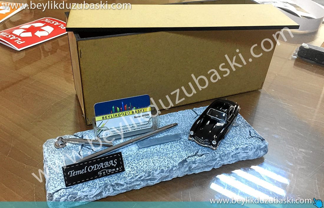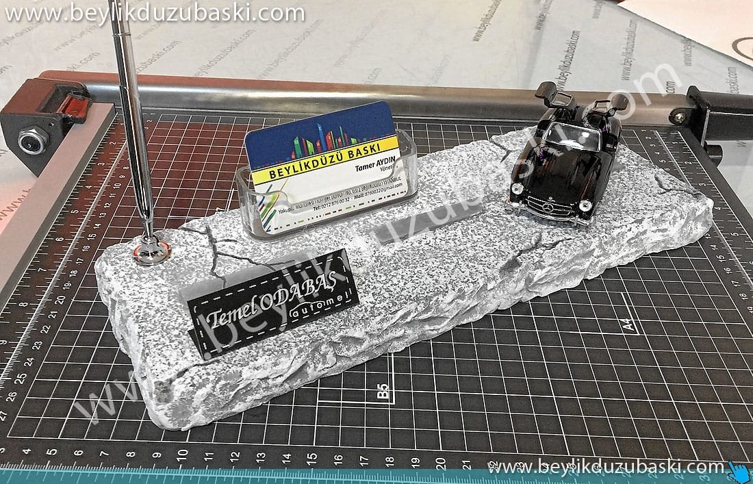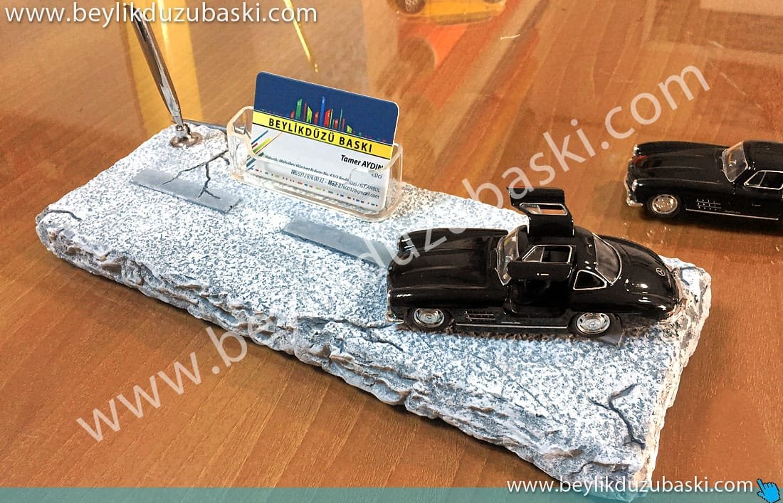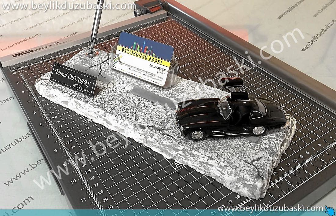 galeri masa isimliği, araç konseptli, isim baskılı, kalemlik, kartvizitlik, masa üzeri taş döküm, el boyaması ürün