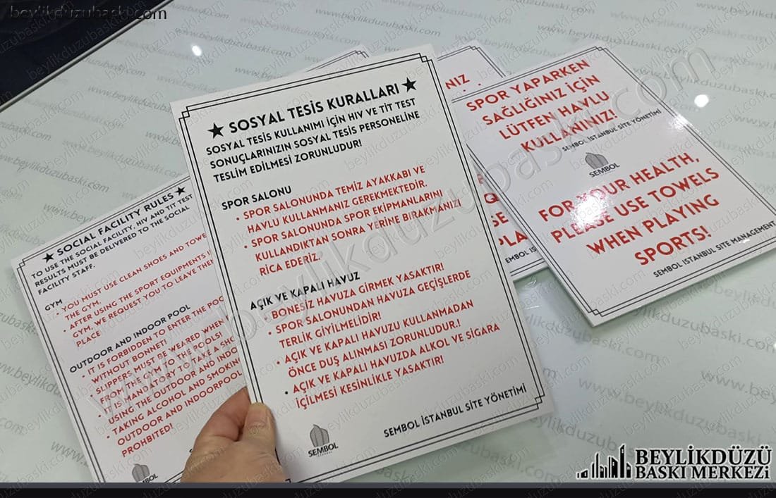 sosyal tesis uyarı levhası, tesis içinde kullanım alanları, uyarı levhası, imalat, türkçe ve ingilizce, kaliteli uyarı levhası, özel tasarım ve ebat