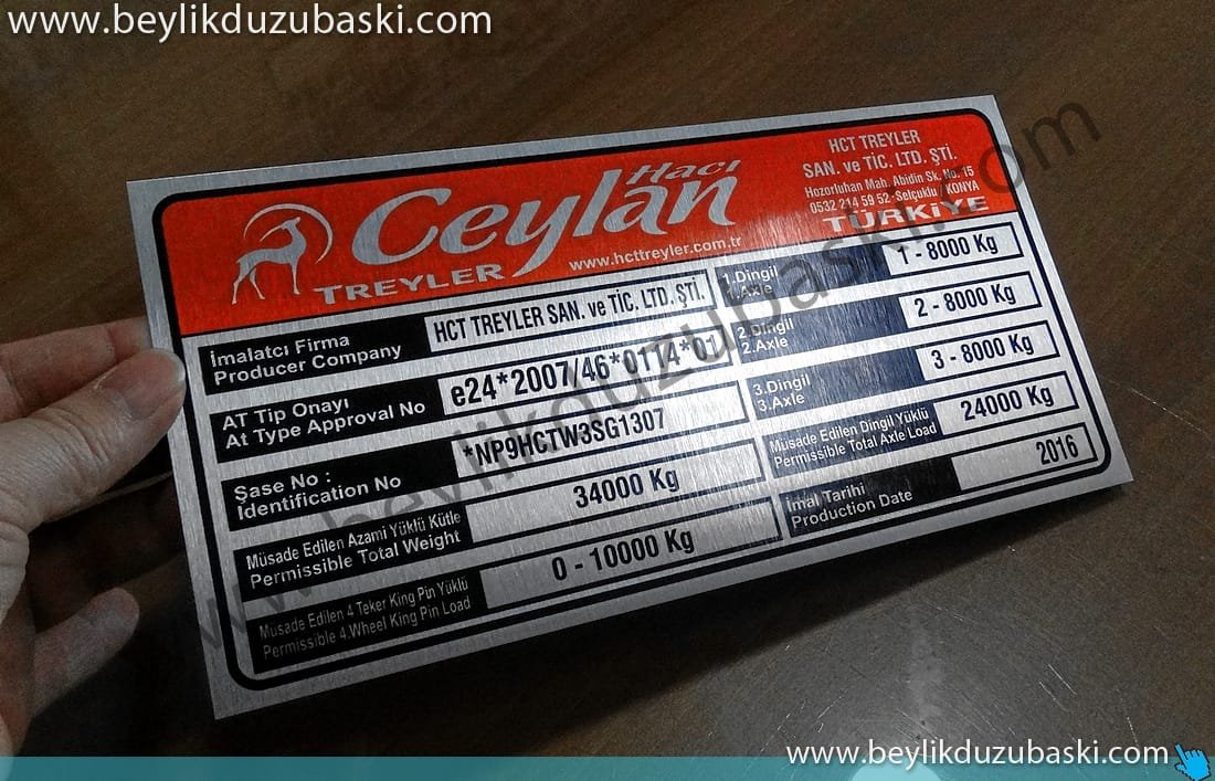 treyler için, metal etiket baskısı, ceylan treyler metal plaka, kamyon ve taşıyıcı araçlara, metal tanırım tabela baskısı, aynı gün teslim, tasarım desteği, az adet üretim