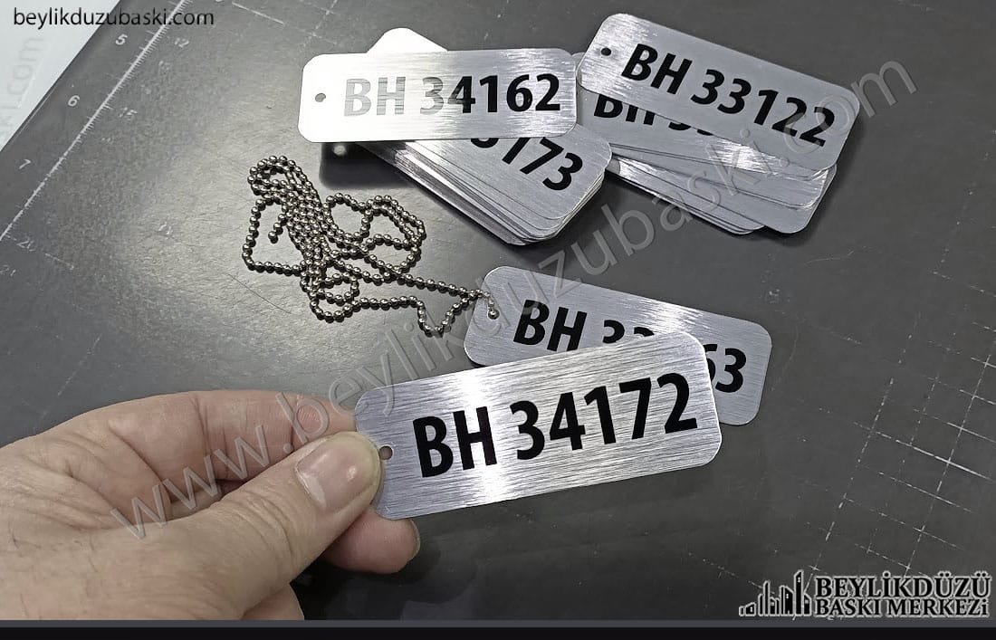 zincirli, metal plaka baskıları, üçgen kesimli, zincir bağlı, metal plaka imalatı, metal plaka imalatı, acil metal etiket, alüminyum zincirli plaka baskısı, kaliteli metal baskıları